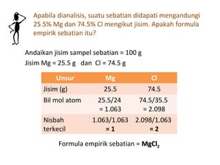 . Empirical formula Nisbah Fe2O3 ringkas mol Simplest ratio of mole c Apakah formula empirikal bagi Unsur Karbon C HydrogenH pembentukan sebatian apabila 6 g 6 2 karbon berpadu dengan 2 g Element hidrogen 612 05 21 20 Jisim g What is the empirical formulae for the 05 05 20 05 formation compound when 6 g of Mass g 1 4. 18 kg 800 g. Ungkapkan setiap nisbah berikut dalam bentuk termudah.